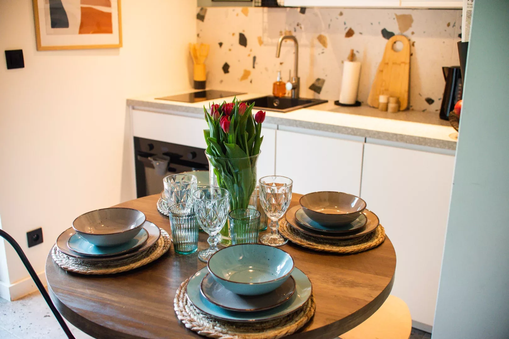Panoramiczne okno w salonie zaprasza naturę do środka. Miłośnikom gotowania, komfort odpoczynku zapewni w pełni wyposażona kuchnia z płytą indukcyjną, lodówką, zmywarką, ekspresem do kawy, czajnikiem elektrycznym, blenderem kielichowym, piekarnikiem elektrycznym z mikrofalą oraz tosterem. Na parterze znajduje się również łazienka z ubikacją i prysznicem a także pralko-suszarka.