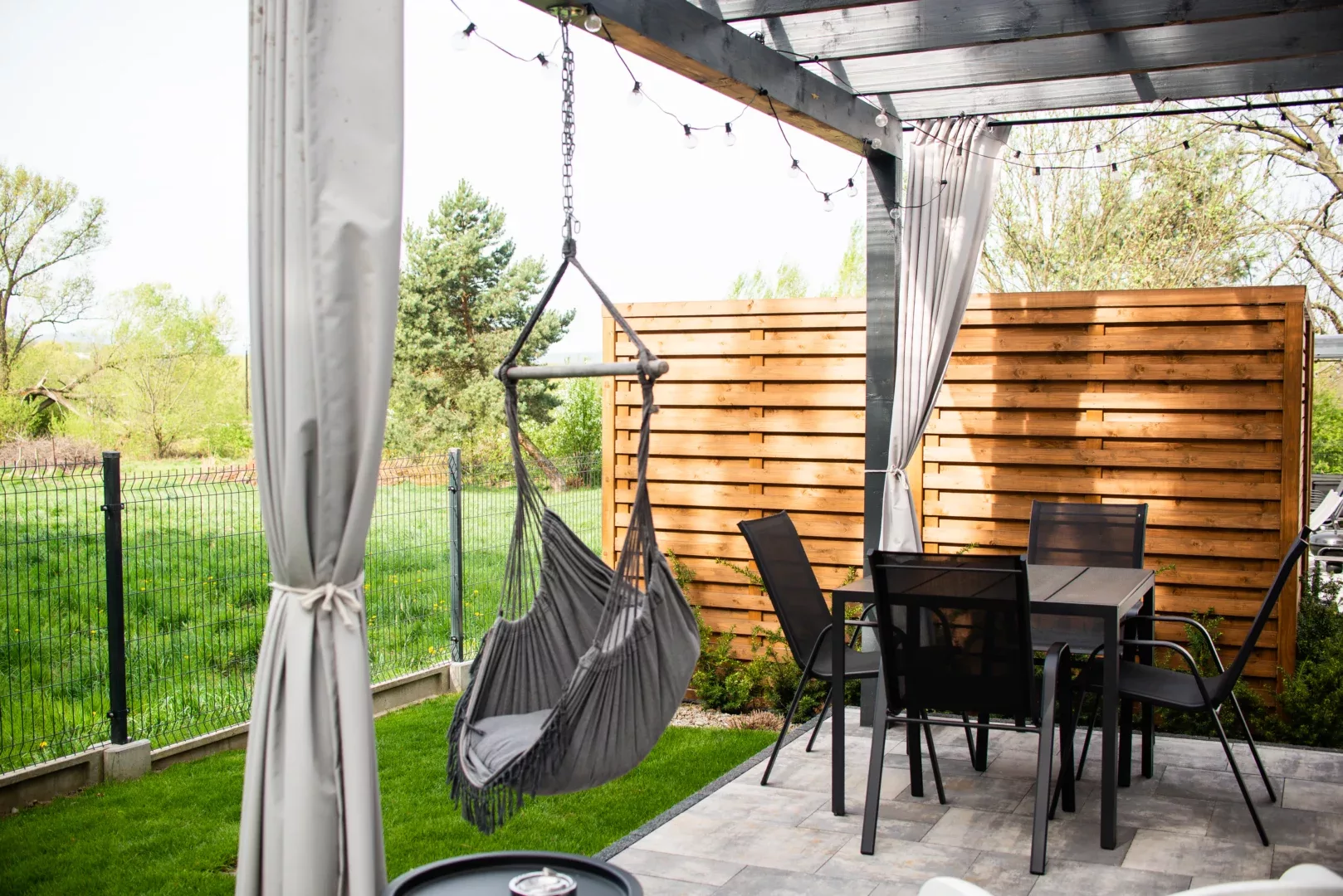 Sypialnia z podwójnym łóżkiem i miejscem do przechowywania ubrań znajduje się na antresoli. Na zewnątrz jest duży taras z meblami ogrodowymi, hamakiem do siedzenia, oraz grillem.
