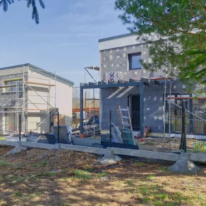 Pogoda jeszcze nie rozpieszcza ale wykorzystujemy każdy cieplejszy dzień. Na zewnątrz domków powstają elewacje oraz ogrodzenia, montowane są systemy bezpieczeństwa. Wewnątrz równolegle trwa meblowanie, podłączanie mediów oraz biały montaż.