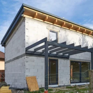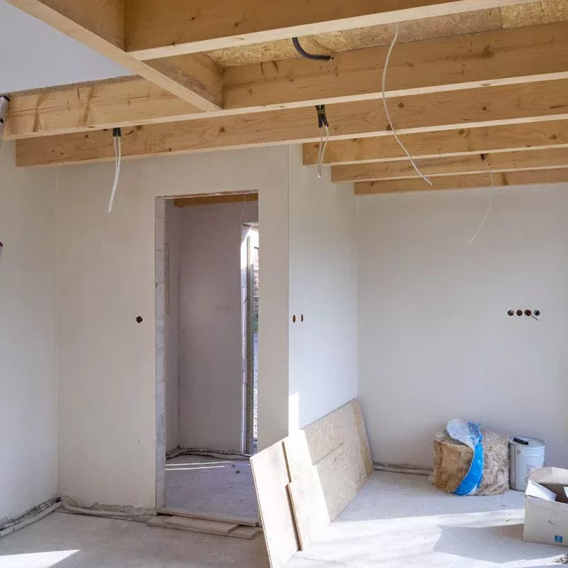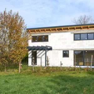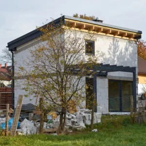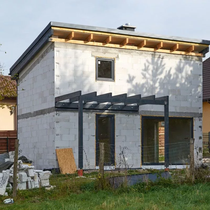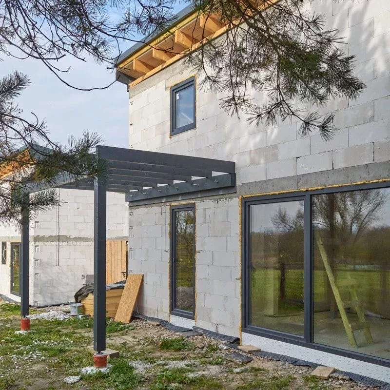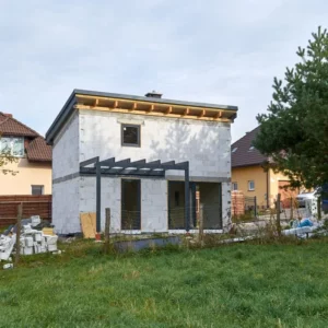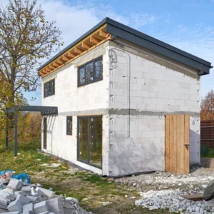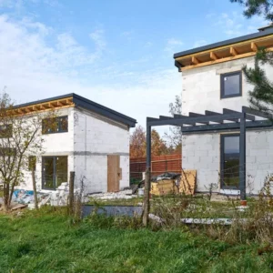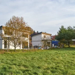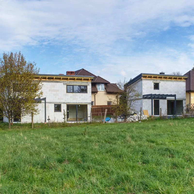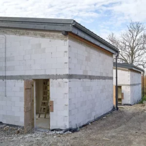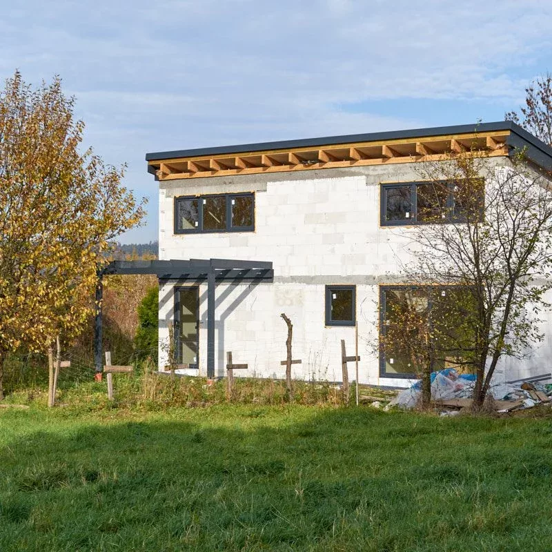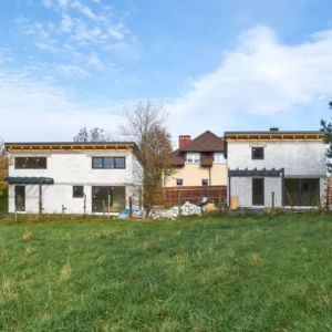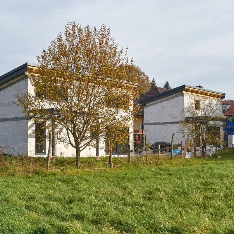 Trwają intensywne prace budowlane, równoległe prace nad obydwoma budynkami. Dach oraz stolarka okienna zamontowane. Początek jesieni przywitaliśmy na etapie stanu surowego zamkniętego.