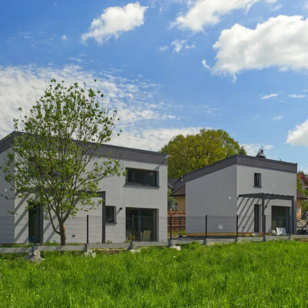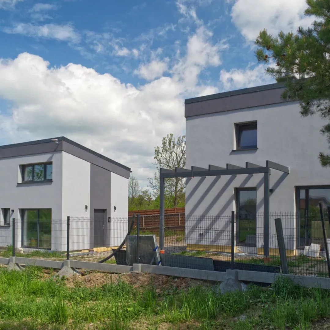 Słoneczna i ciepła majowa pogoda pozwoliła nam na prace nad elewacjami obu domków. Montaż ogrodzenia, bramy oraz automatyki także na ukończeniu.